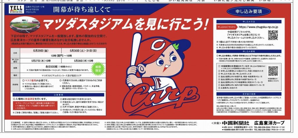 開幕を待ち望んでいるファンに向け、5月21日(木)、22日(金)、23日(土)の3日間、マツダスタジアムを一般開放するそうです。新型コロナウイルスの感染拡大防止…
