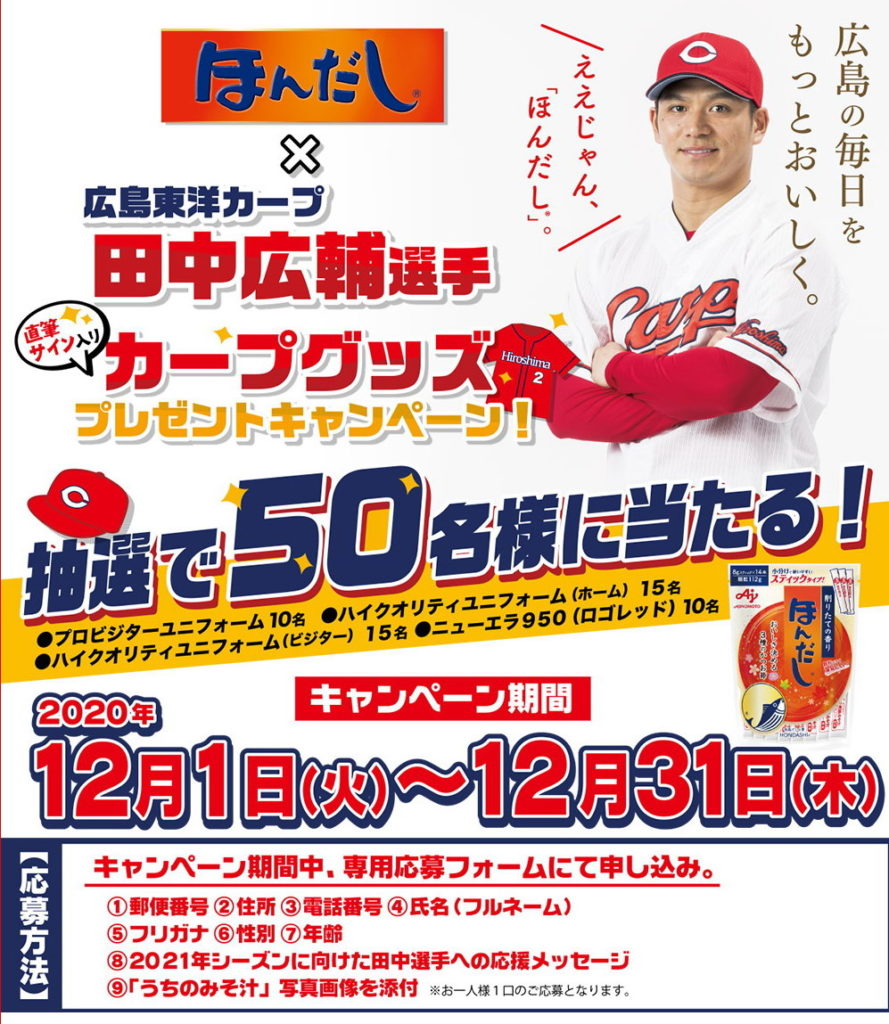 カープ田中広輔選手とほんだしのコラボキャンペーン!直筆サイングッズが当たる