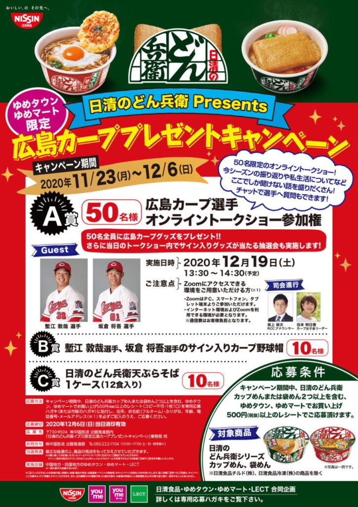 日清のどん兵衛とカープのコラボイベント、今年はオンラインで! 塹江投手と坂倉捕手参加