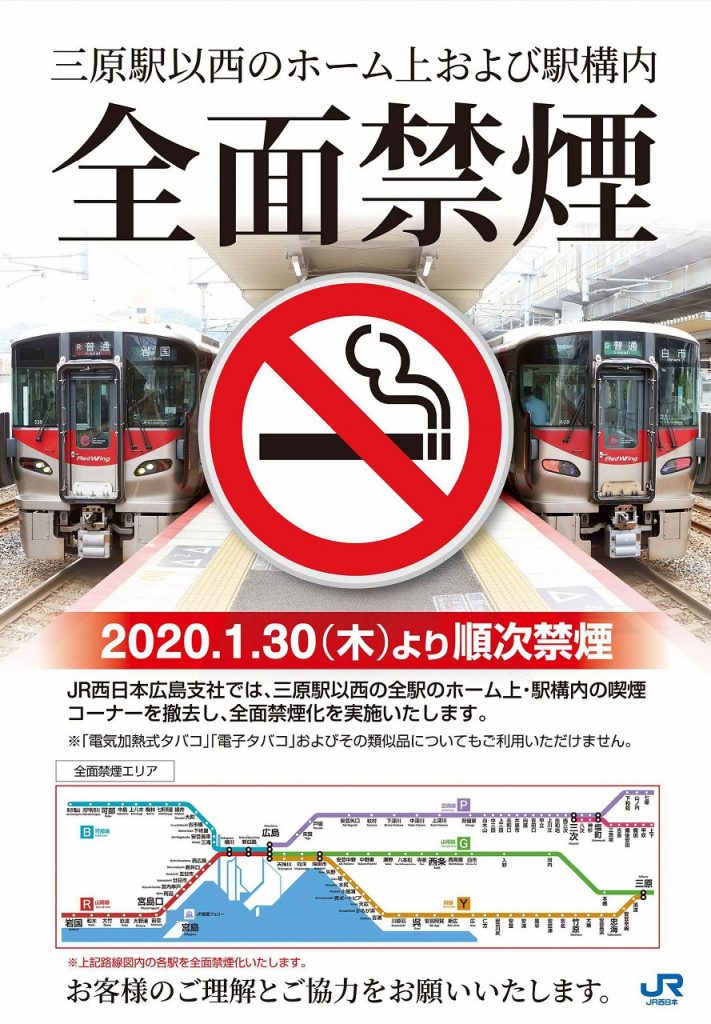 JR西日本 広島支社管内の在来線で駅構内全面禁煙化!山口は本日1/27(月)~、広島は1/30(木)~