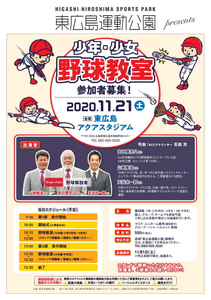 11月21日(土)に「東広島運動公園」でカープOBの方が参加される「少年・少女野球教室」が開催されます!参加されるOBの方は、安仁屋宗八さん、山崎隆造さん、天谷…