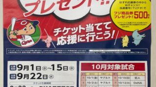 先日フジに行ったところ、恒例となっているカープ観戦ペアチケットのプレゼント企画が実施されていました。応募期間は9月15日(水)まで。期間中に対象店舗で5,000 … 続きを読む フジで10月のカープ観戦ペアチケットが当たる応募キャンペーン実施中!9月15日(水)まで