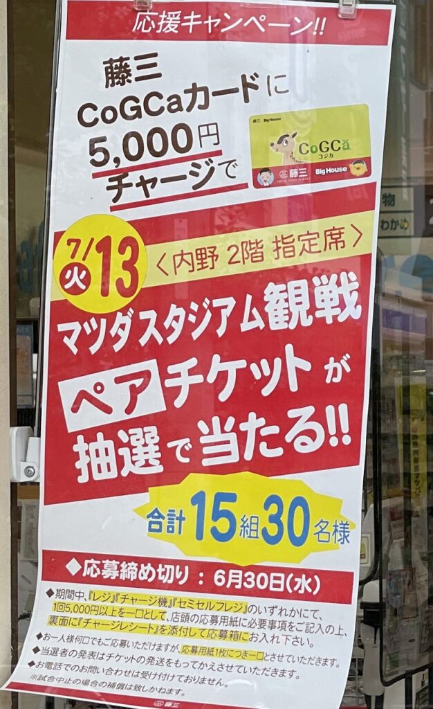 藤三でCoGCaカードにチャージでカープ観戦チケットが当たるキャンペーン実施中!