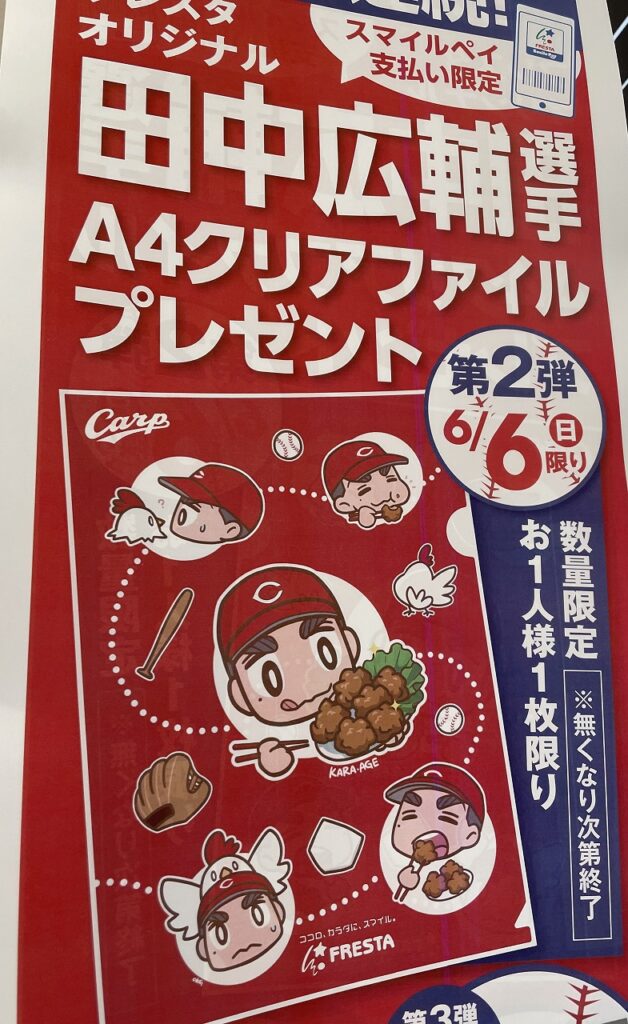 フレスタで田中広輔選手のオリジナルクリアファイルプレゼント企画実施中!第2弾は6/6(日)