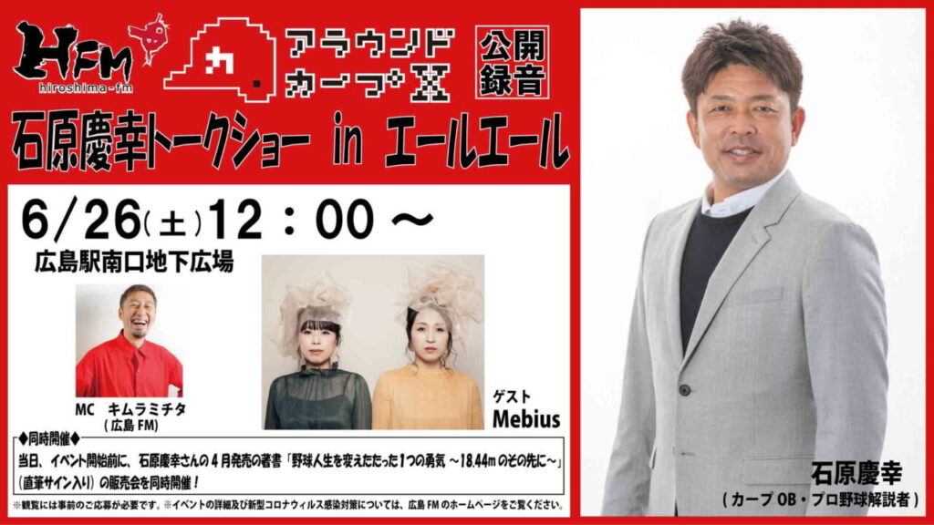 6月26日(土)に広島駅南口地下広場で広島FM「アラウンドカープX」の公開録音が行われます。そしてトークゲストは、カープOB石原慶幸さん!さらに、菊池選手の登場…