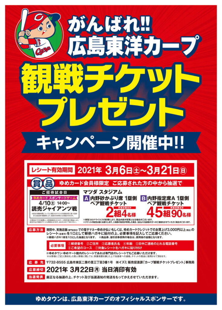 ゆめタウンやゆめマートを展開するイズミで、現在「がんばれ!!広島東洋カープ『観戦チケットプレゼント』キャンペーン」が実施されています! 期間中に実施店舗で電子マ…