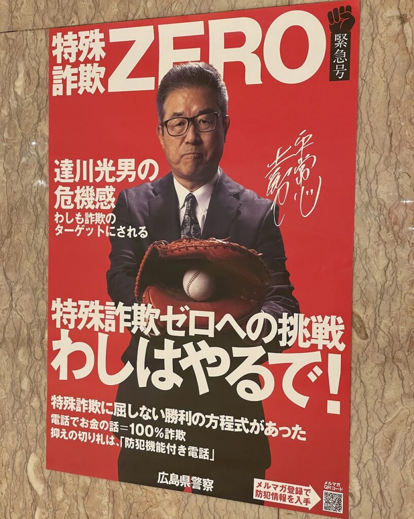 「グラウンドの詐欺師」として知られたカープOB達川光男さんを起用した啓発広告を展開している広島県警から、新たに特殊詐欺防止の啓発動画が作られました!ポスターも新…