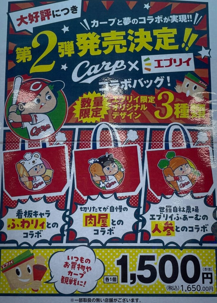 話題となったエブリイとカープのコラボバッグ!その第2弾が登場しました! 今回は3種類。ふわリィとのコラボや、大きなお肉・にんじんを持ったカープ坊やのデザインとな…