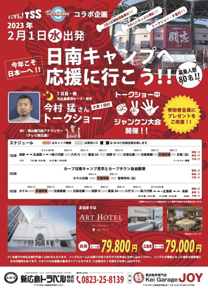 TSSのスポーツ番組「全力応援 スポーツLOVERS」と新広島トラベルのコラボ企画として、「日南キャンプへ応援に行こう!!」ツアーが開催されます! 2023年2…