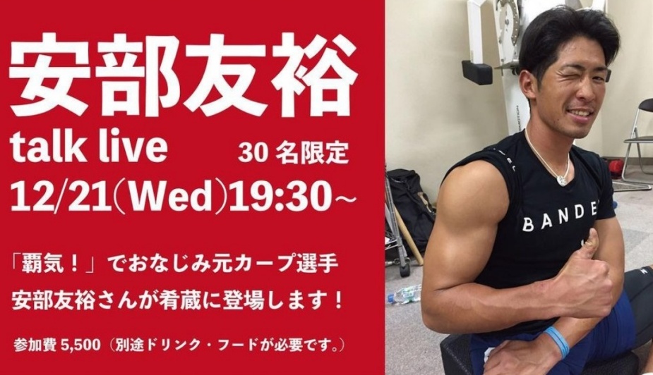 福山市にある「創菜酒膳 肴蔵」(さかぐら)さんで、カープを引退された安部友裕さんのトークライブが12月21日(水)に開催されるそうです!30名限定で完全予約制と…