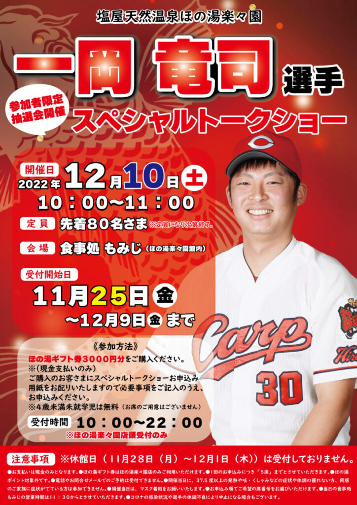 「ほの湯 楽々園」で12/10(日)にカープ一岡投手のスペシャルトークショー!先着80名