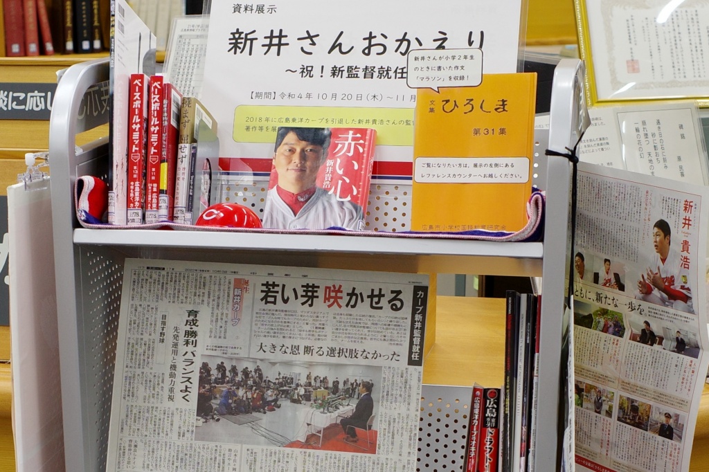 カープの新監督として新井貴浩さんが再びユニフォームを着るようになったことを記念し、広島県立図書館で関連書籍の展示が行われています。 「新井さんおかえり~祝!新監…