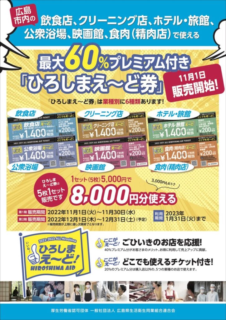 飲食店や映画館、クリーニング店等で使える「ひろしまえ〜ど券」本日11/1(火)販売開始!