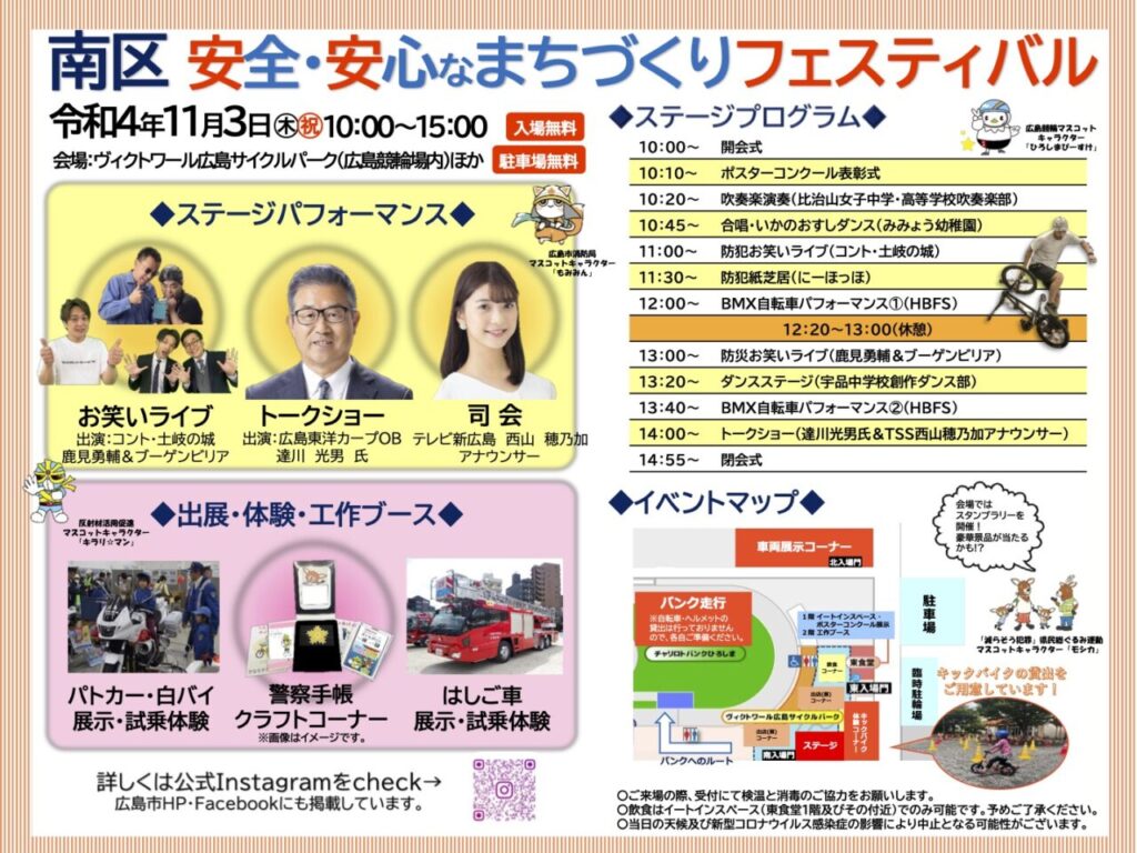 3年ぶりに開催する「南区安全・安心なまちづくりフェスティバル」がヴィクトワール広島サイクルパーク(広島競輪場)で開催されます!イベントは明日11月3日(木・祝)…