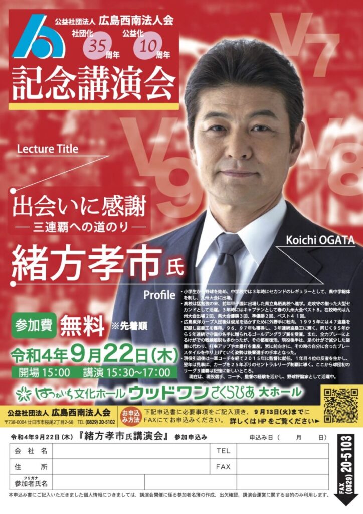 廿日市市にある公益社団法人広島西南法人会による、カープ元監督・緒方孝市氏の講演会が9月22日(木)に開催されます! テーマは「出会いに感謝ー三連覇への道のりー」…