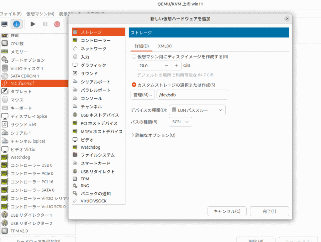 またパススルーするには、ストレージの追加で「/dev/sdb」などと選択し、「LUNパススルー」を選びます。