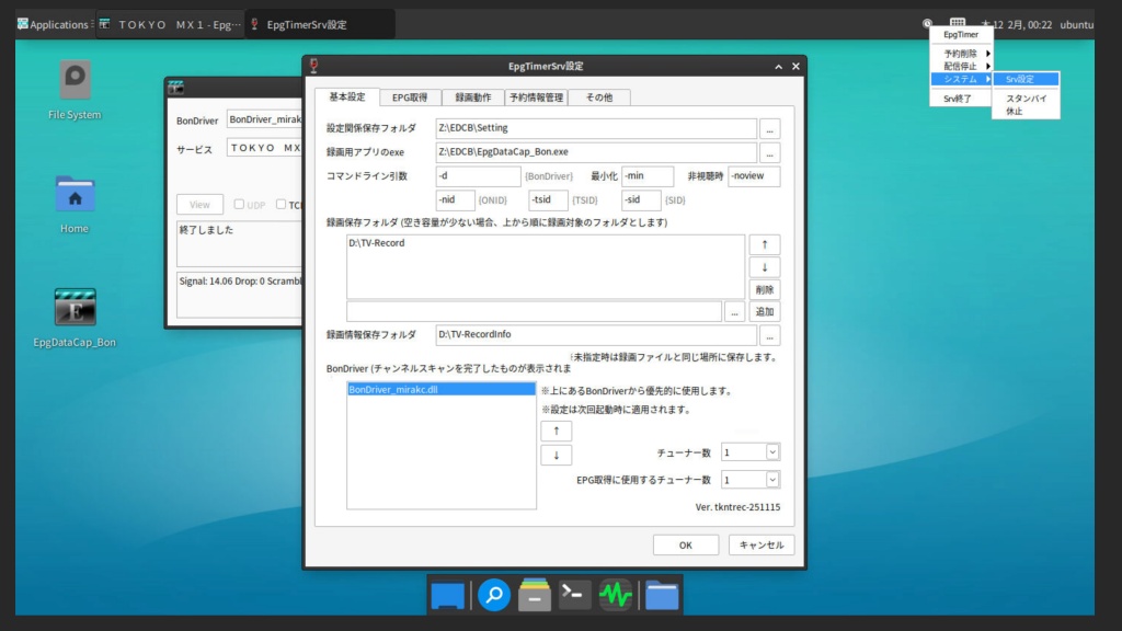 再度、Xfceのデスクトップ環境に戻り、デスクトップにある「EpgDataCap_Bon」をダブルクリックすればチャンネル情報などが読み込まれているはずです。