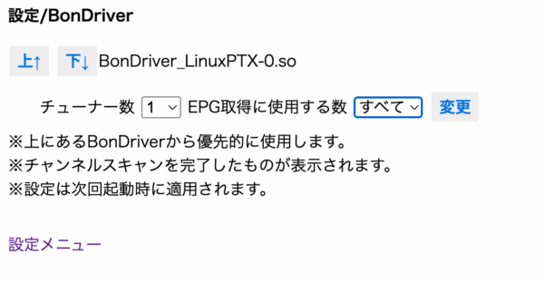 起動したら、http://127.0.0.1:5510 などにアクセスし、最低限、設定メニューのBonDriverの数を指定します。