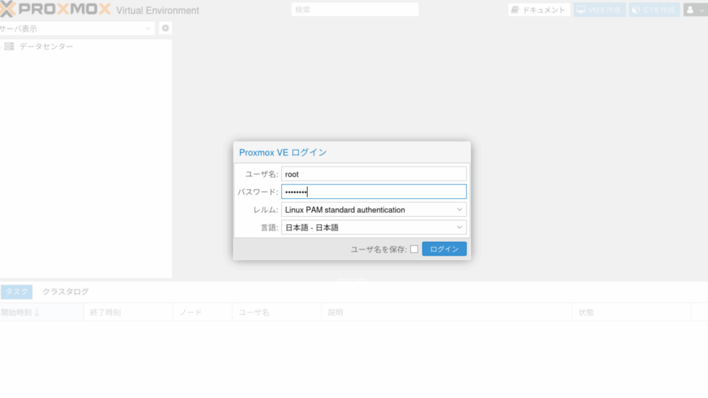 ここまできたら、別のパソコンからhttps://IPアドレス:8006でアクセス出来るようになるので、ここからはWeb上から進めます。