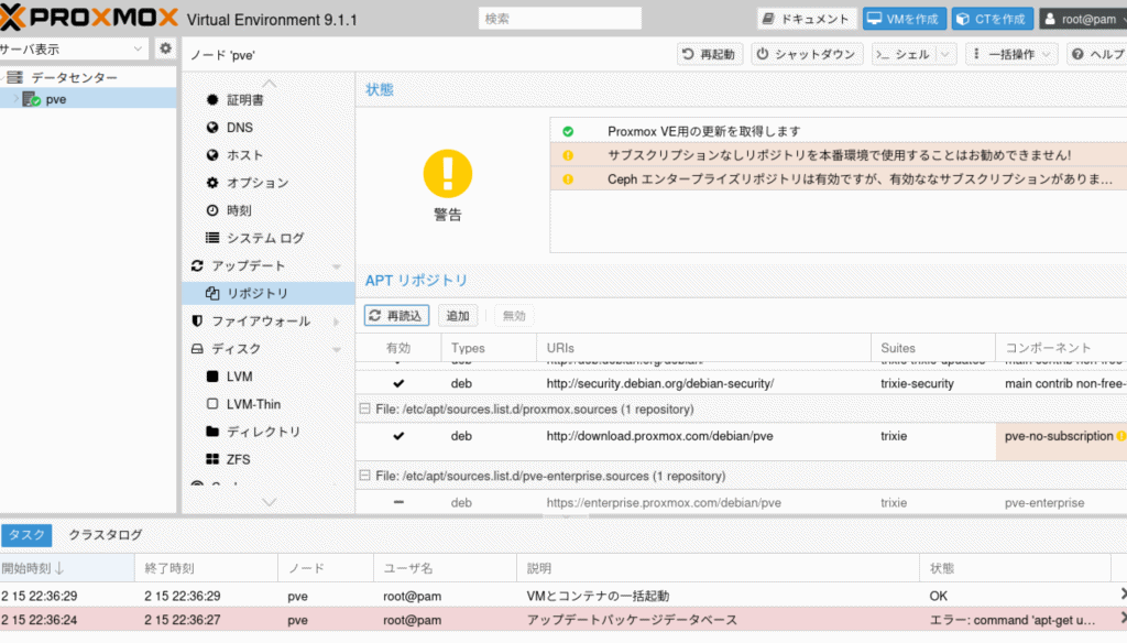 ログインしたら、まずはリポジトリを変更しましょう。現在は有料のサブスクリプション向けリポジトリが登録されているため、「追加」ボタンを押して「No-Subscription」を追加し、次に「enterprise」が入っているリポジトリを「無効」にします。ちなみに、ログイン時に表示されるサブスクリプションがないというメッセージは、今後も表示されます。