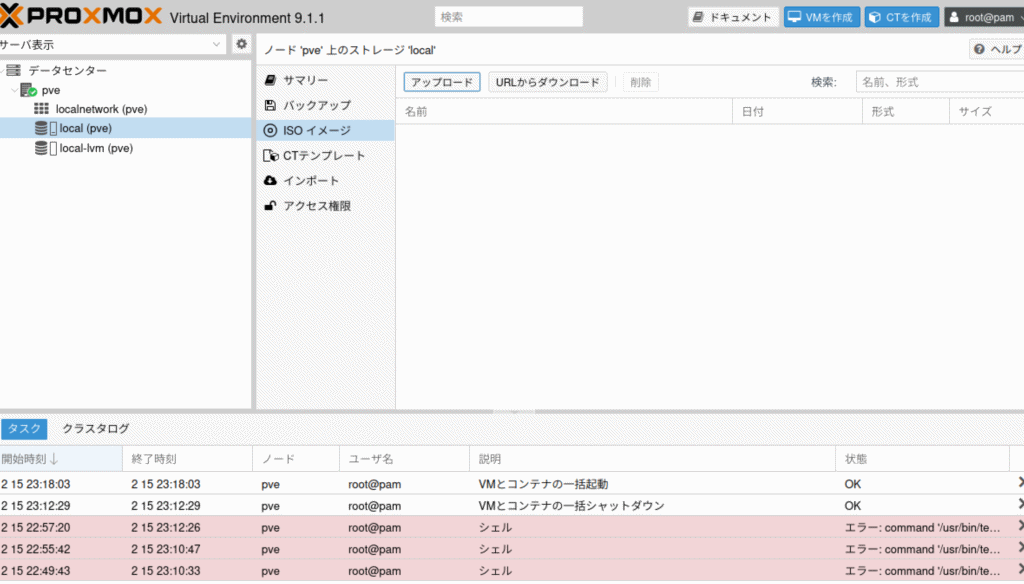 ISOイメージからインストールする場合は、まずProxmox VEにISOイメージを保存します。左側の項目で「local」を選択し、右側で「ISOイメージ」を選択し「アップロード」を行います。