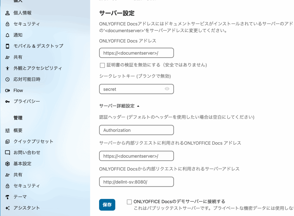 次は「管理者設定」の「ONLYOFFICE」を開き、以下を入力します。