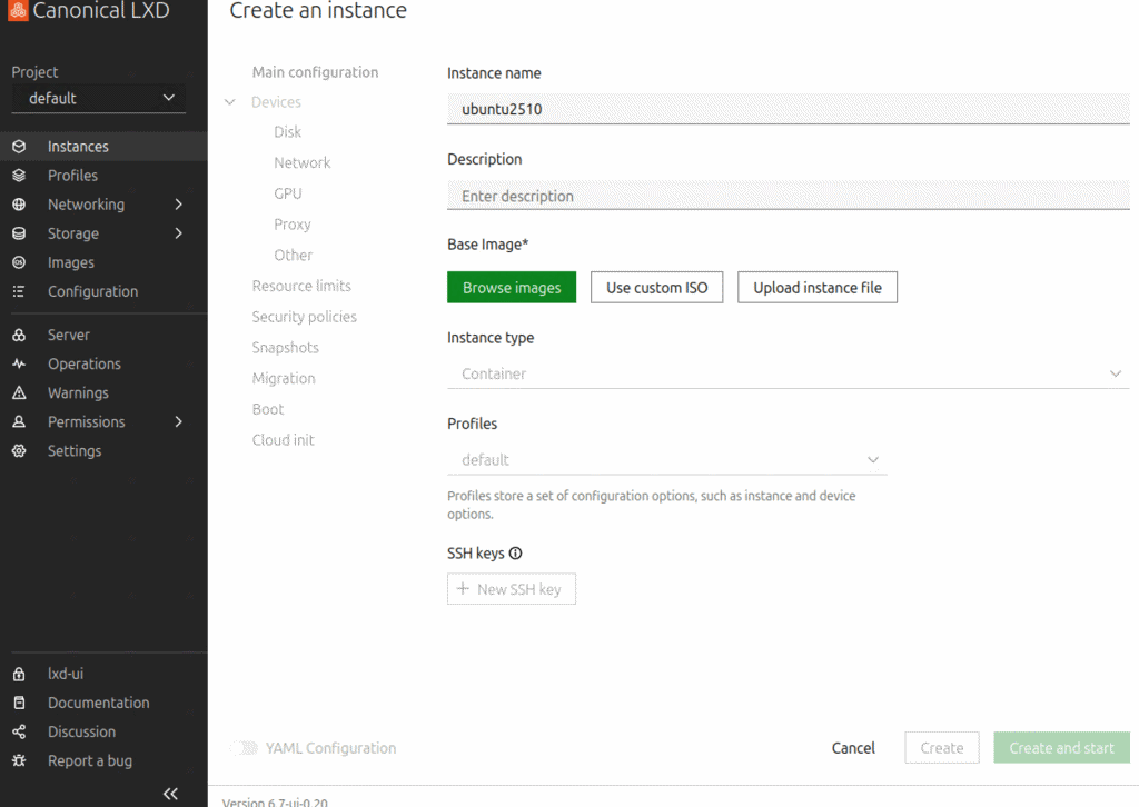 LXD UIからコンテナを作成するには、まず「Create instance」をクリックして、インスタンス名(コンテナ名)を入力し、「Base Image」を選択します。