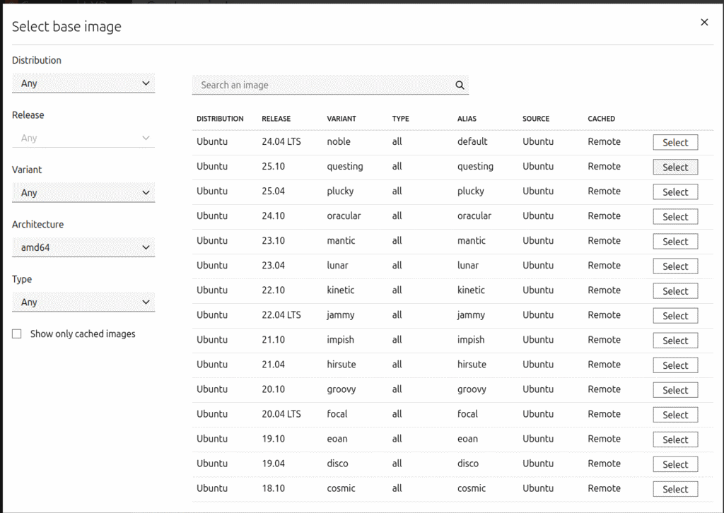 「Browse images」ボタンを押すと対応イメージが表示されます。ここでは「Ubuntu 25.10」を選択しています。