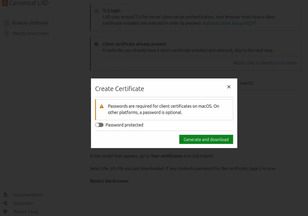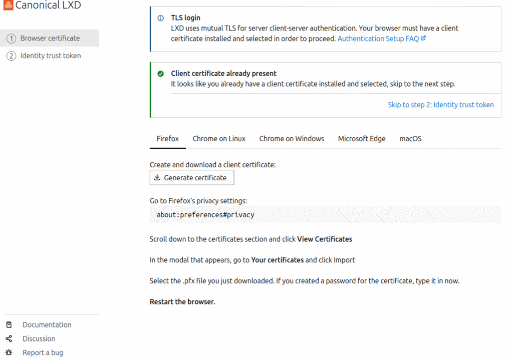 Firefoxに証明書をインポートしてLXD UIにログインします。