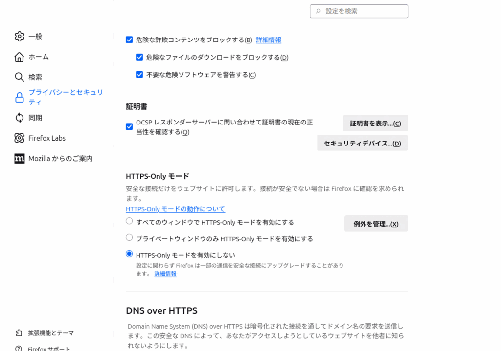 Firefoxの場合、「設定」-「プライバシーとセキュリティ」項目で、「証明書を表示」を押します。