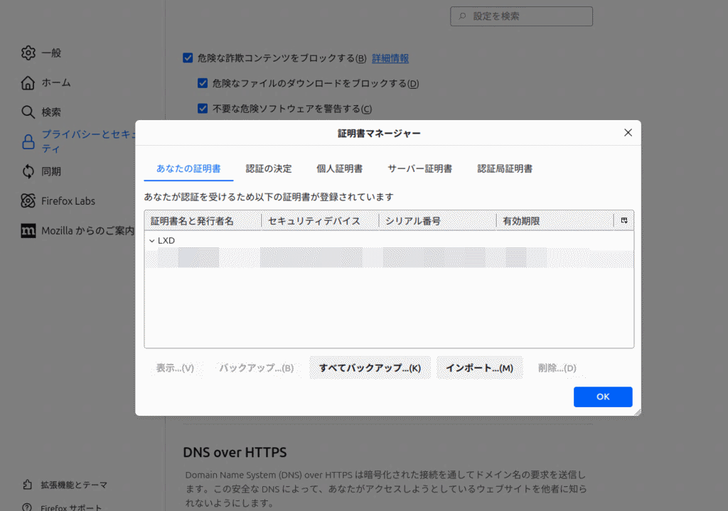 lxd-client.pfxを選択し、設定したパスワードを入力- Firefoxを再起動