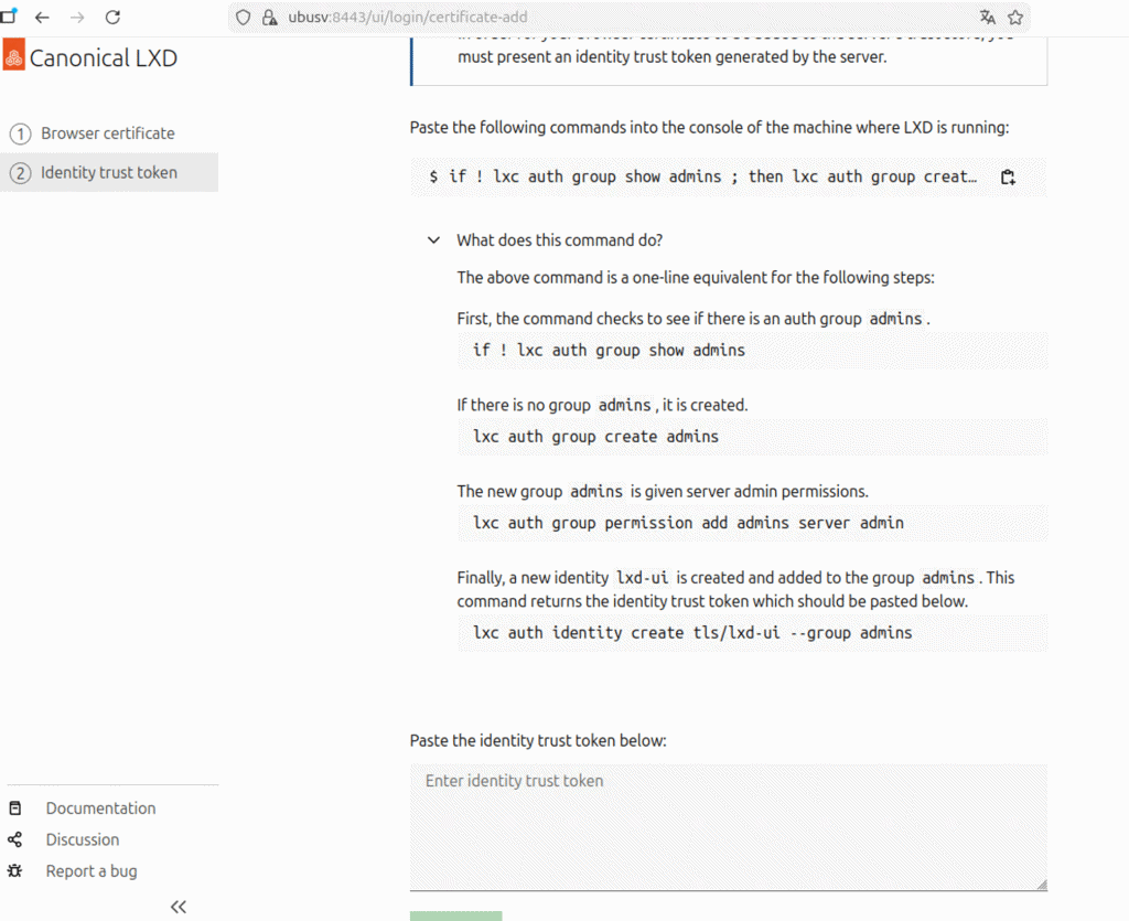 if ! lxc auth group show admins ; then lxc auth group create admins; fi && lxc auth group permission add admins server admin && lxc auth identity create tls/lxd-ui --group admins