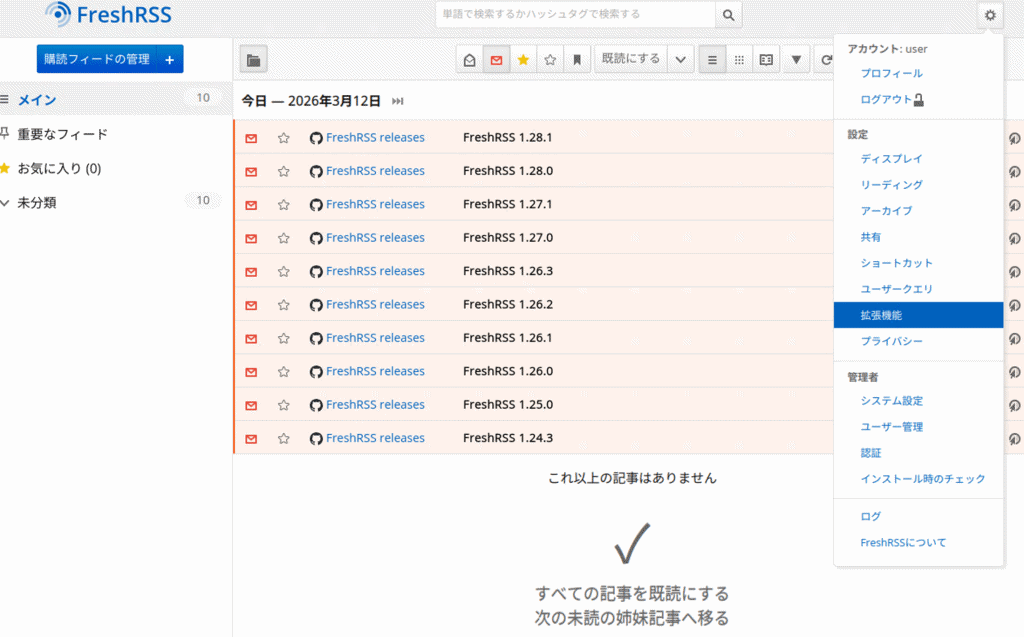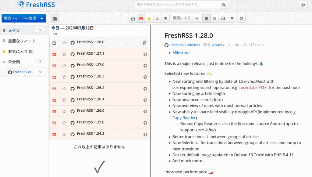 そんな中、良さそうなRSSリーダー「FreshRSS」を見つけたので入れてみました。カスタマイズするとGoogleリーダーの頃と同じような感じ、いやもっと前のFeedDemonと同じようにサクサクと閲覧出来ます。どんな感じだったかはもう忘れてしまいましたが。