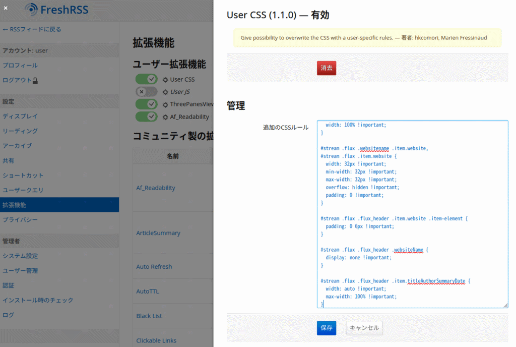 フィード一覧やタイトル一覧を狭くして記事ページを大きく、タイトル一覧の幅が狭くなるとタイトルがほとんど見えなくなるので日付表示を隠す設定にしています。数値を調整して好みの幅にできます。#aside_feedがフィード一覧、#streamが記事タイトル一覧です。さらに、タイトル一覧が少しでも長く出るように、タイトル一覧ペインのフィード名は非表示にしてアイコンだけにし、そのぶんタイトル一覧が長く出るようにしています。