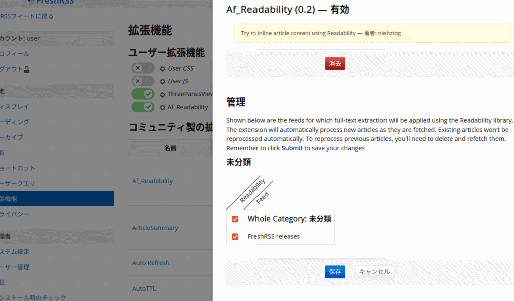 ThreePanesViewプラグインとAf_Readabilityプラグイン導入済みなので、トグルスイッチをOnにします。Af_Readabilityプラグインは歯車のところをクリックすれば、対象のフィードを選択出来ます。読み込み済みのフィードには適用されないので、フィードを追加した時には忘れずに設定しましょう。
