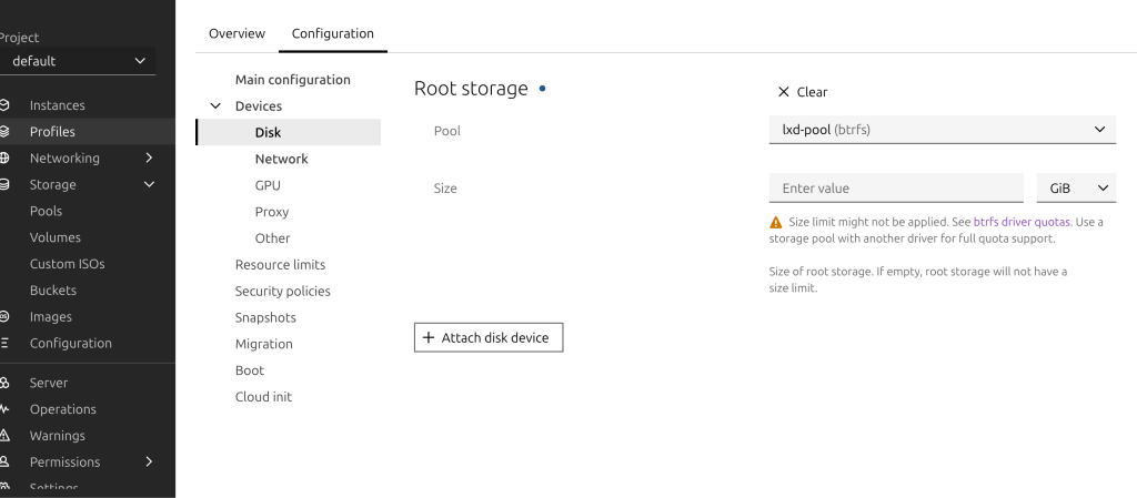 LXDのストレージプールとして、作成したサブボリュームを指定します。