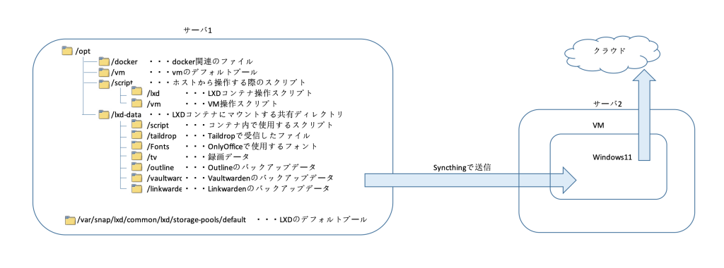 - /opt/lxd-dataをコンテナにマウント。ただ、大抵はコンテナ内で完結するようにして、バックアップデータの保存先などに利用する程度。その意味ではOnlyOfficeで使用するFontsもコンテナ内に閉じ込めたほうが良いのかも。