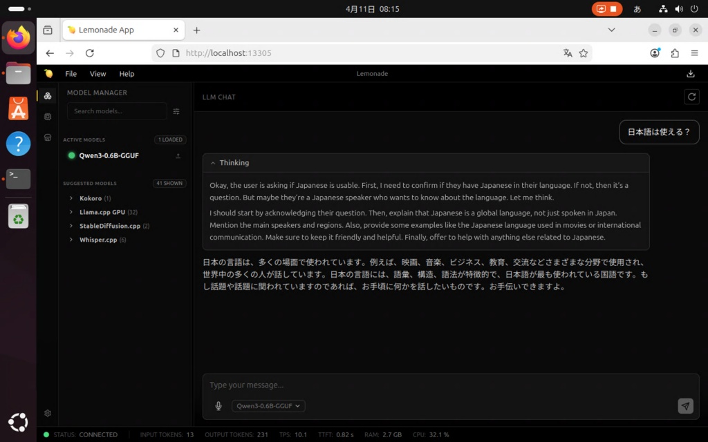 起動したら、何か話しかけると、初回は自動的にモデルのダウンロードが行われ、回答が返ってきます。