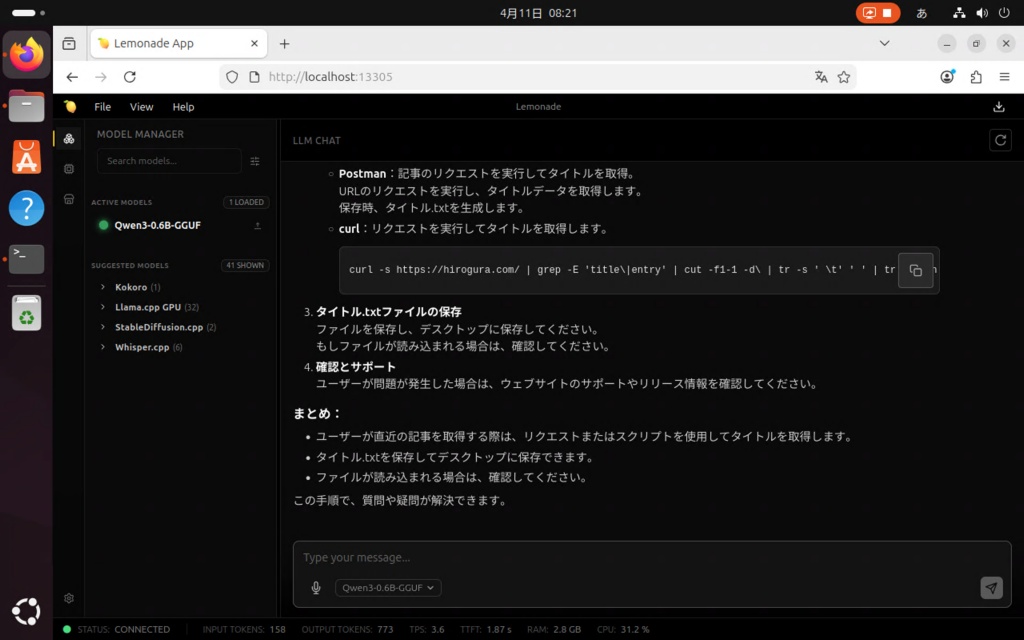 ローカル環境で大規模言語モデル(LLM)や音声認識(Whisper)などのAIを、AMD製のGPUやNPU(Ryzen AI)を活用して高速・簡単に動作させるためのオープンソースソフトウェア「Lemonade」が手軽に導入出来そうだったので試してみました。