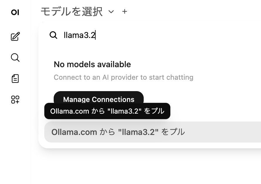 アカウントを作成したら、まずは左側の「モデルを選択」から好きなモデルを検索して、プルでダウンロードします。おすすめのモデルは、llama3.2、gemma2:9b、mistral、phi3 など