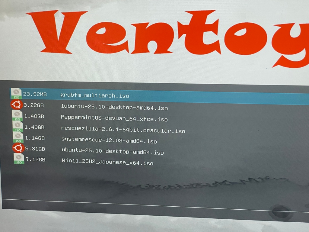 一部、Ventoyではうまく起動しないISOがあったりしますが、対処法としてgrubfm_multiarch.isoを追加しておき、起動できない場合はGRUB2経由で起動してみればうまくいくことが多いです。