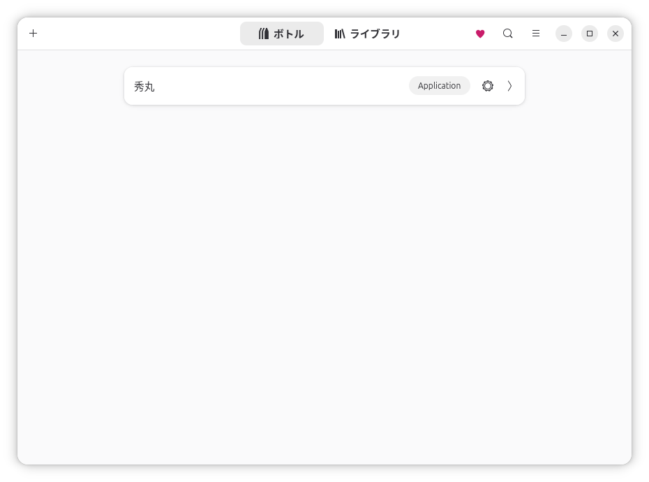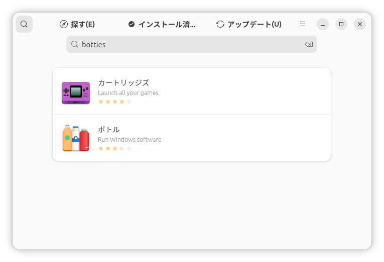 パソコンを再起動したら、「ソフトウェア」(アプリセンターではなく)を起動し、「bottles」で検索すれば表示されるはずなのでインストールします。