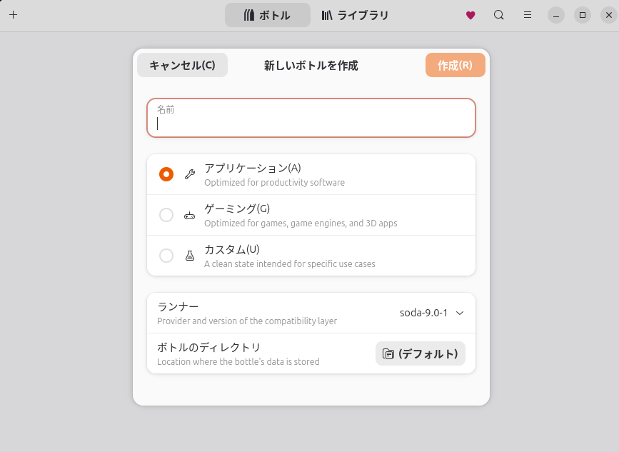 Bottlesのインストールが終わったら、新しいボトルを作成します。必要な依存ファイルなどは勝手にインストールされるので、ダウンロードしたインストーラーなどを実行するだけ。
