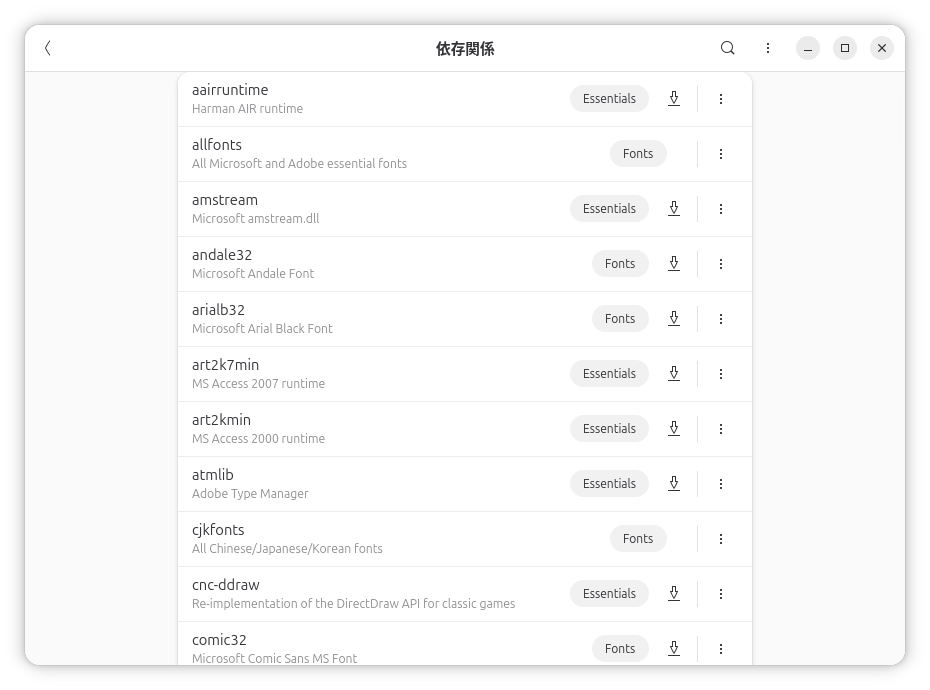 Wineの複雑な設定(依存関係、ライブラリ、フォントなど)を自動で管理してくれるグラフィカルなツールです。
