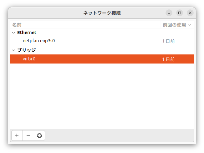 既存のvirbr0を編集しても良いのですが、新たに追加します。左下の「+」を押します。