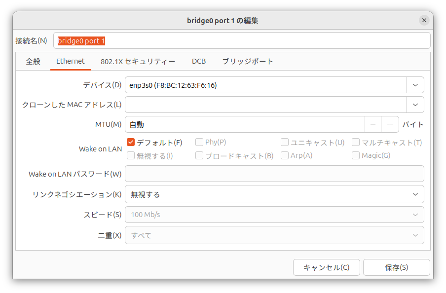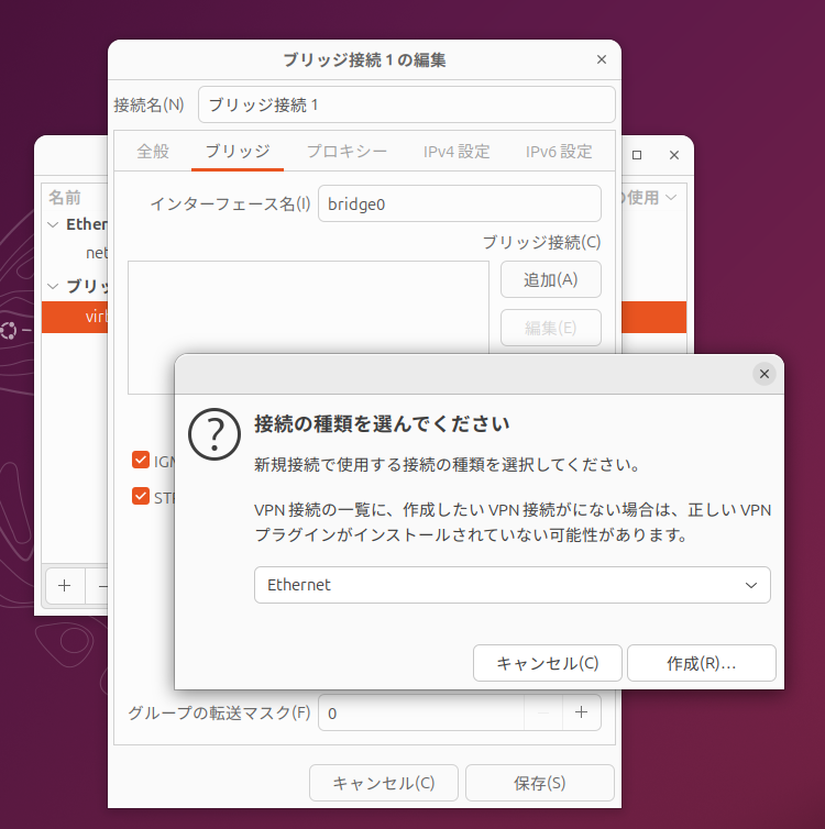 作成し終えたら、Ubuntuでの接続先を先ほど作成した「bridge0 port 1」を選択します。